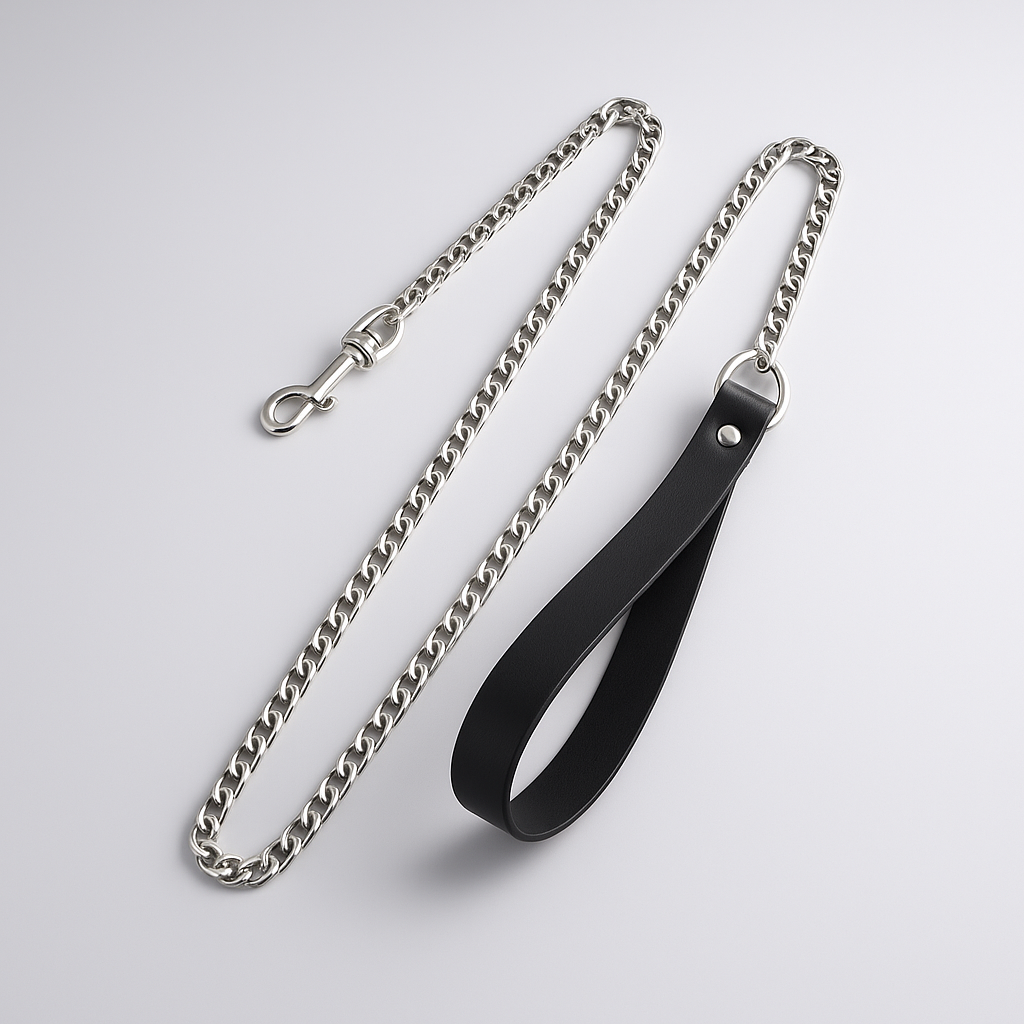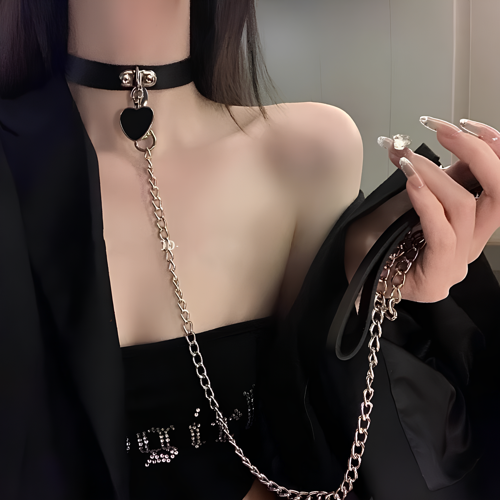 Le monde joue gentiment. Pas vous. Enveloppé de cuir avec une laisse en acier froid, ce ras-de-cou n'est pas qu'un accessoire—c'est une déclaration : intouchable, irrésistible, dangereux.