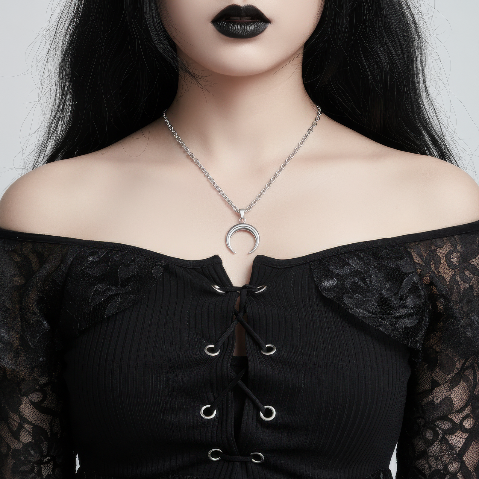 Pas rêveur—dangereux. Un croissant qui se lit comme une lame et rend chaque tenue plus froide.