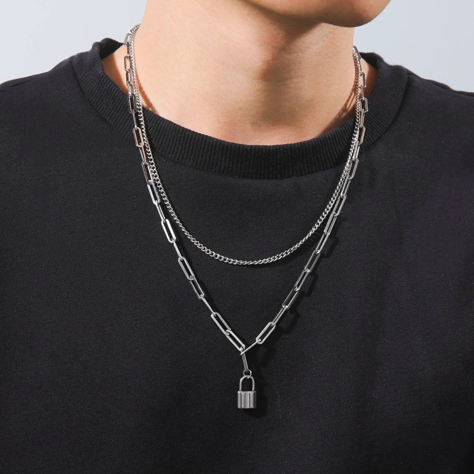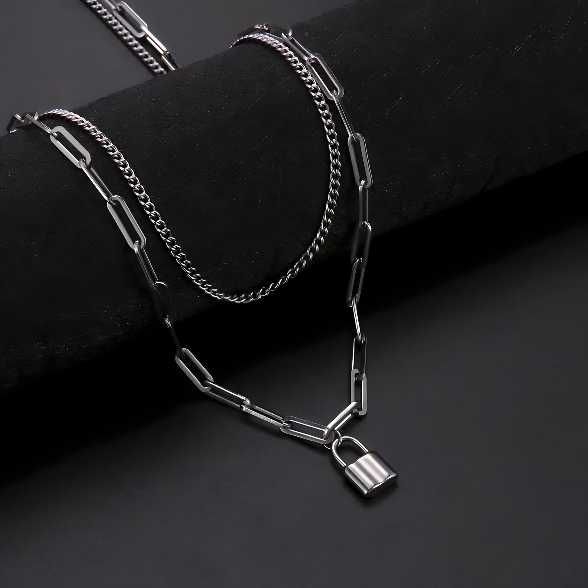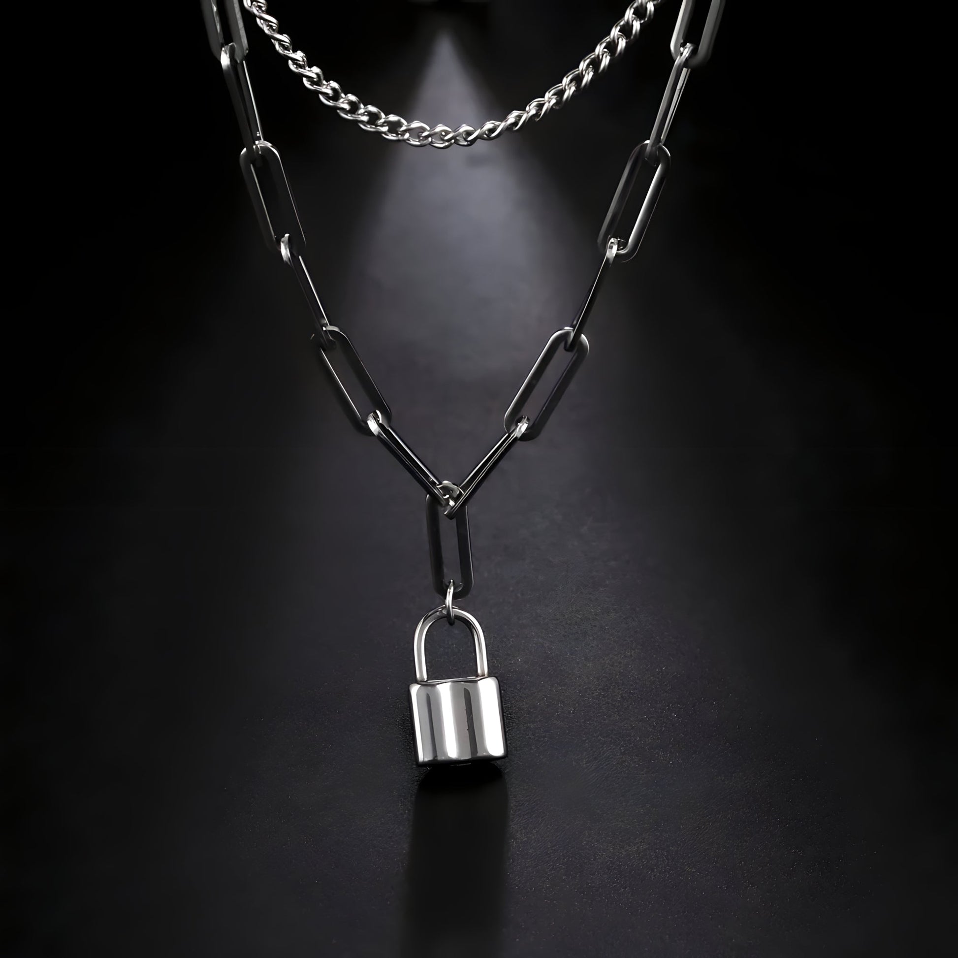 Verrouillé. Pas de clés, pas de compromis. Cette chaîne double couche frappe fort avec des bords industriels et un cadenas qui dit ce que vous ne direz pas—intouchable, imperturbable, et construit pour les tenir à l'écart.